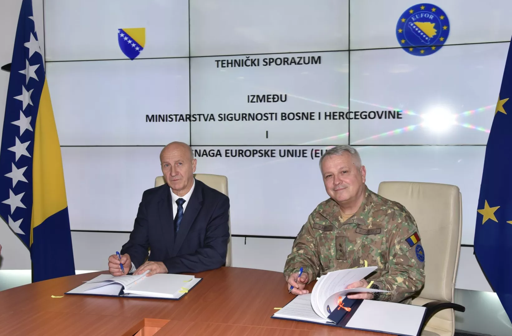 Zamjenik ministra bezbjednosti Bosne i Hercegovine Ivica Bošnjak i komandant Snaga Evropske unije u BiH (EUFOR) general-major Florin Marian Barbu danas su u Sarajevu potpisali tehnički Sporazum o saradnji Operativno-komunikacijskog centra BiH - 112 i EUFORA-a.