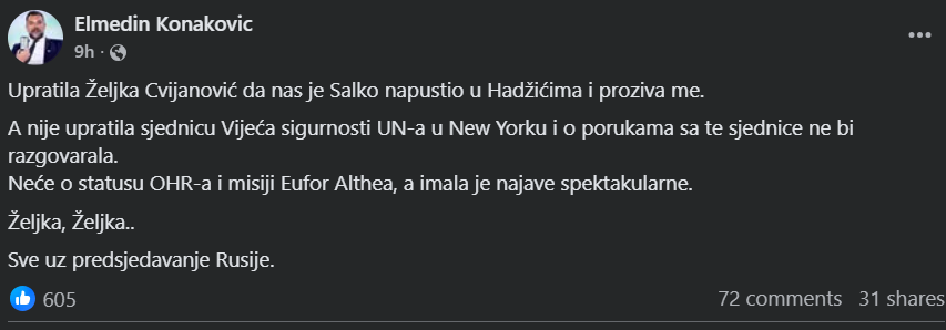 "Upratila Željka Cvijanović da nas je Salko napustio u Hadžićima i proziva me. A nije upratila sjednicu Vijeća sigurnosti UN-a u New Yorku i o porukama sa te sjednice ne bi razgovarala. Neće o statusu OHR-a i misiji Eufor Althea, a imala je najave spektakularne. Željka, Željka.. Sve uz predsjedavanje Rusije", napisao je Konaković.
