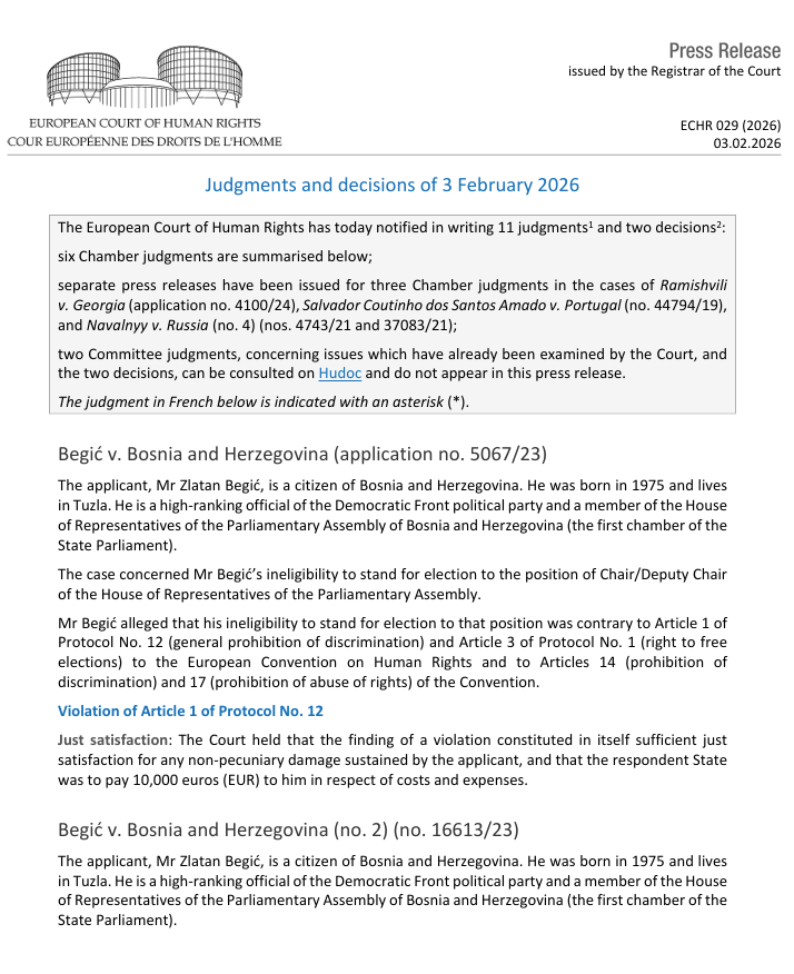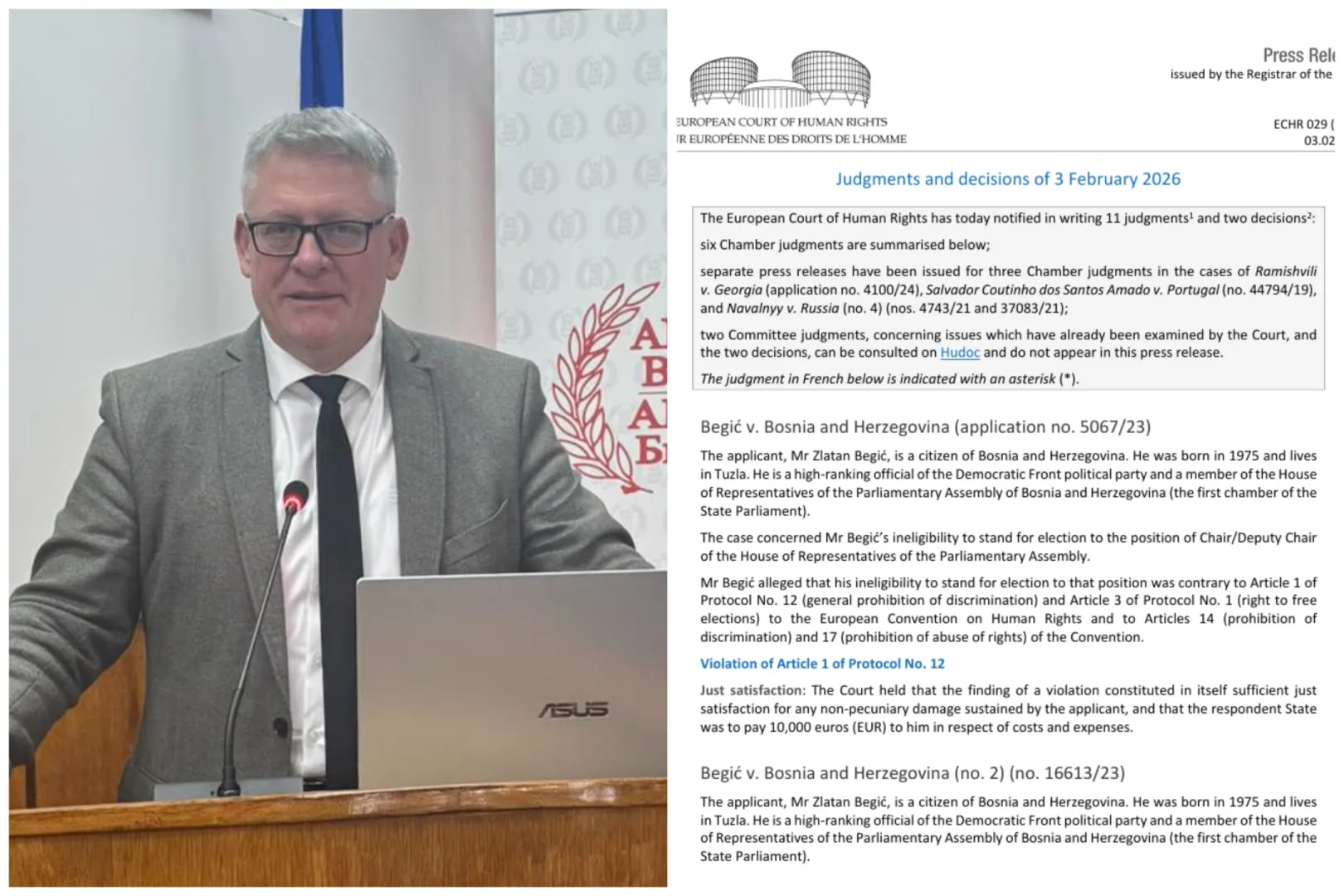 Evropski sud za ljudska prava u Strazburu (ECHR) presudio je u dva slučaja da su ljudska prava Zlatana Begića, zastupnika DF-a u Parlamentarnoj skupštini BiH – prekršena.