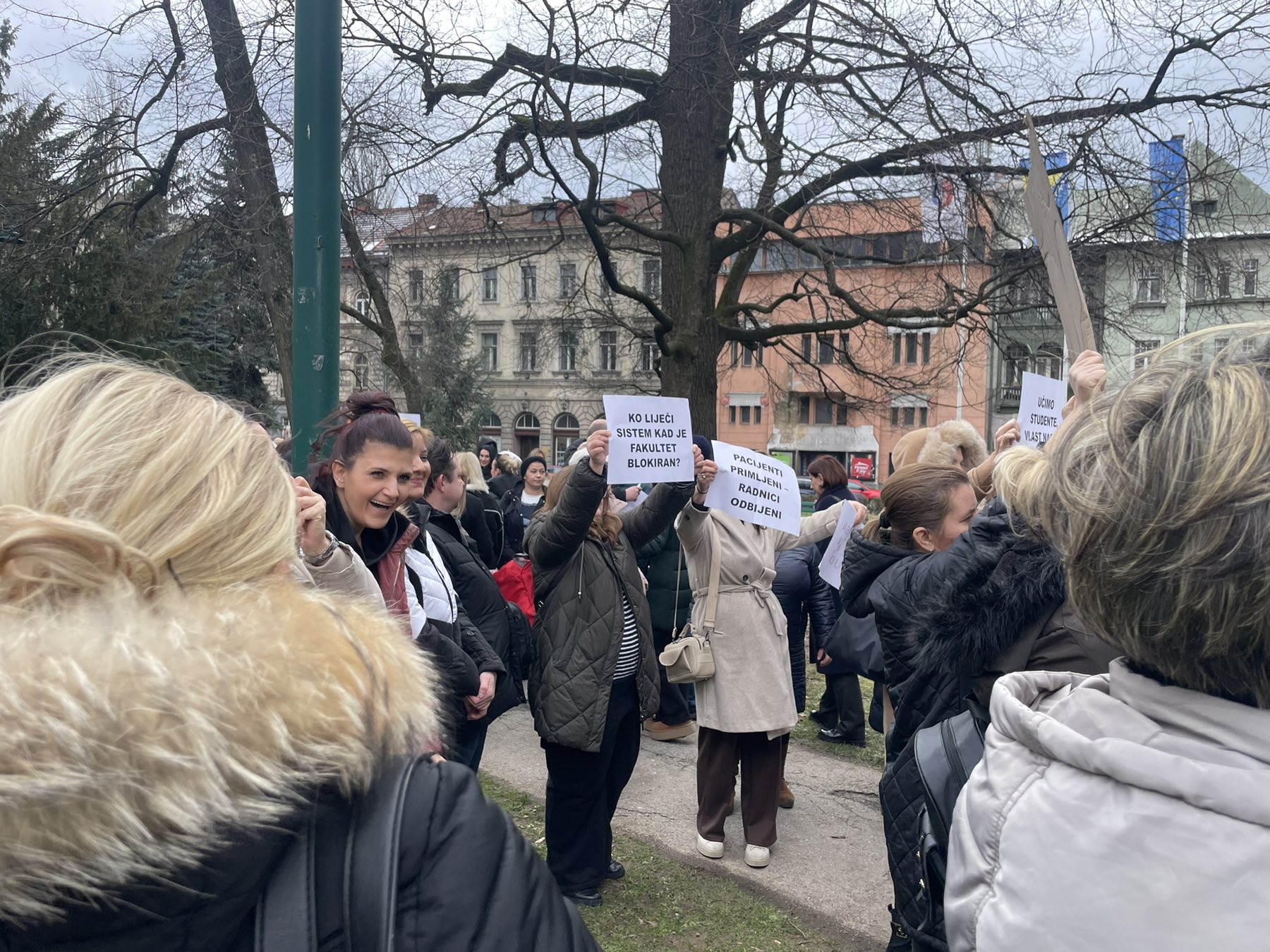Radnici Stomatološkog fakulteta u Sarajevu stigli su na proteste ispred zgrade Vlade Kantona Sarajevo, koje organizira Sindikat radnika u zdravstvu KS.