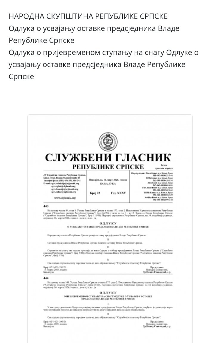 "U postupku donošenja Odluke o usvajanu ostavke predsjednika Vlade RS utvrđeno je da postoje naročito opravdani razlozi da navedena odluka stupi na snagu narednog dana od dana objavljivanja", piše u Odluci.