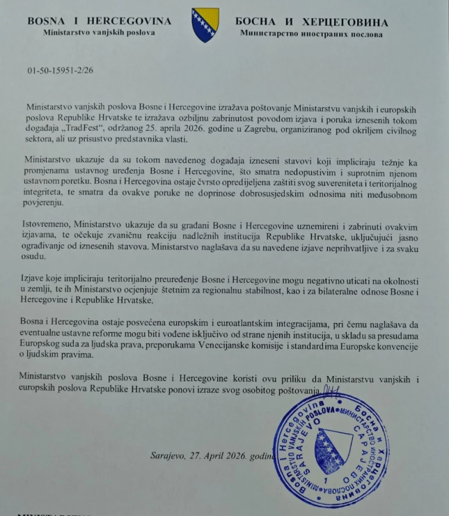 Ministarstvo vanjskih poslova BiH uputilo je protestnu notu Hrvatskoj.