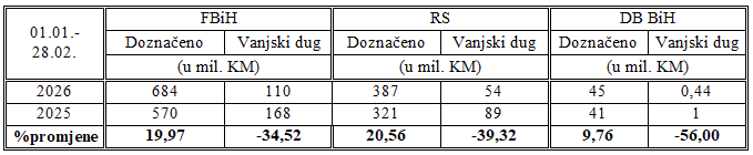 U tabeli je prikazano ukupno raspoređena sredstava entitetima i Brčko distriktu BiH sa pripadajućim vanjskim dugom za prva dva mjeseca 2026. godine u poređenju sa istim periodom prošle godine. Svi iznosi su iskazani u milionima KM.
