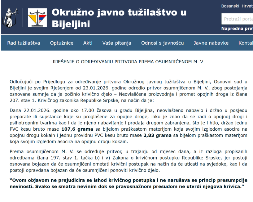 "Osumnjičeni je neovlašteno nabavio i držao u posjedu preparate ili supstance koje su proglašene za opojne droge, iako je znao da se radi o opojnoj drogi i psihotropnim tvarima kao i da je njeno nabavljanje i prodaja drugom zabranjena. Držao je jednu PVC kesu bruto mase 107,6 grama i kesu mase 2,83 grama sa bijelim prahom nalik kokainu", saopštilo je Okružno javno tužilaštvo u Bijeljini.