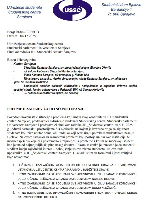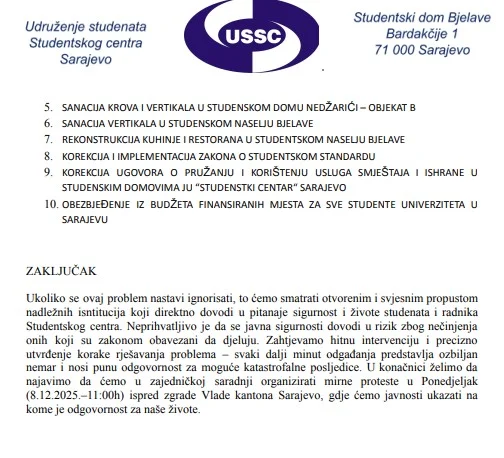 Dopis nadležnim kantonalnim i federalnim vlastima, u kojem se traži rješavanje i drugih problema u smještajima studenata, uputili su Udruženje studenata Studentskog centra, Studentski parlament Univerziteta u Sarajevu i Sindikat radnika "Studentski centar" Sarajevo.