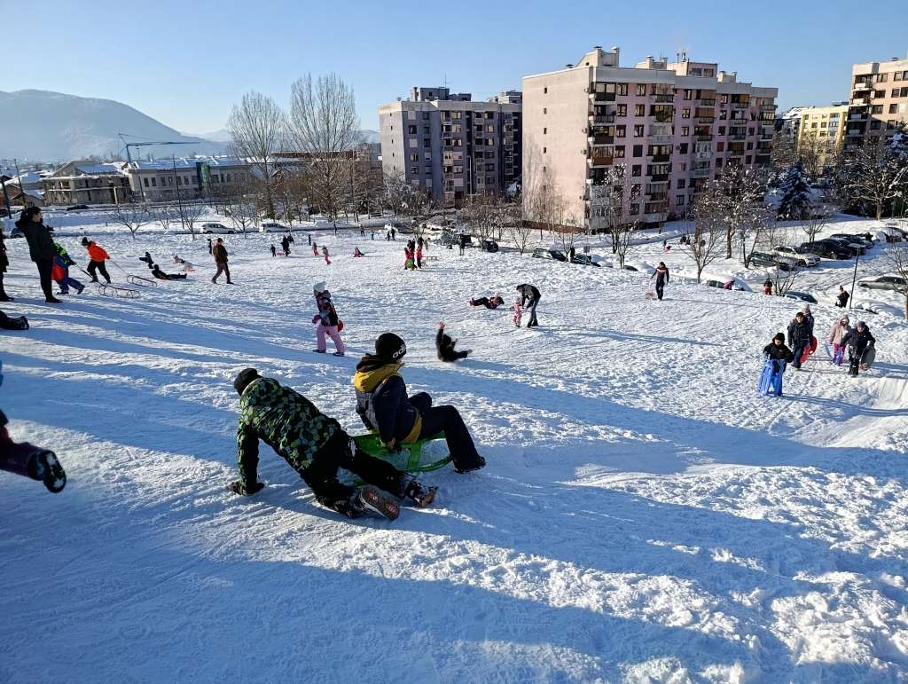 Brojni mališani iskoristili su sunčan dan u dječijim radostima sankanju i igranju na snijegu u sarajevskom naselju Mojmilo.