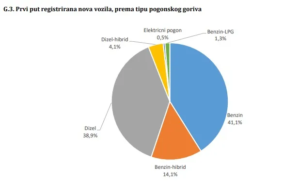 U kategoriji novih putničkih automobila, najveći udio imaju vozila koja kao pogonsko gorivo koriste benzin, sa 42,6 odsto. Samo pola procenta se odnosi na potpuno električna vozila.
