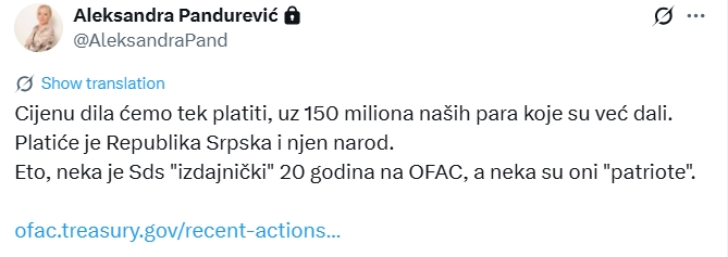 "Cijenu dila ćemo tek platiti, uz 150 miliona naših para koje su već dali. Platit će je RS i njen narod. Eto, neka je SDS "izdajnički" 20 godina na OFAC, a neka su oni "patriote", navela je Pandurević.