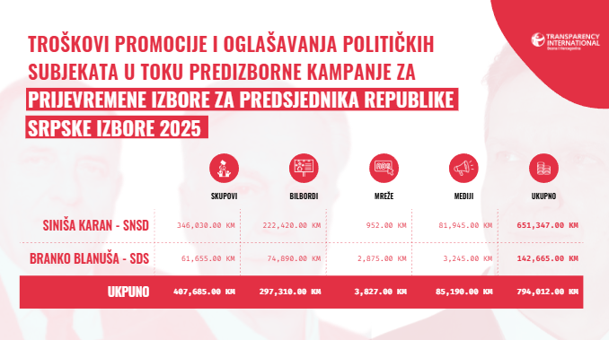 Od tog iznosa kampanja kandidata SNSD-a Siniše Karana koštala je oko 651 hiljadu KM dok je na promociju opozicionog kandidata Branka Blanuše potrošeno oko 142 hiljade KM.