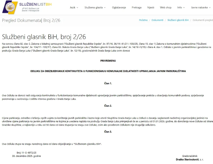 Gradonačelnik Banjaluke Draško Stanivuković objavio je u Službenom glasniku Bosne i Hercegovine odluku kojom se nastavlja naplata parkinga u Banjaluci.