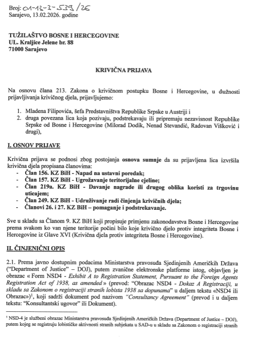 Zastupnici SDP-a, NiP-a, Naše stranke i BHI KF-a u Predstavničkom domu Parlamentarne skupštine Bosne i Hercegovine podnijeli su krivičnu prijavu protiv Mladena Filipovića, šefa Predstavništva Republike Srpske u Austriji, kao i protiv drugih povezanih lica za koja navode da pozivaju, podstrekavaju ili pripremaju aktivnosti usmjerene ka nezavisnosti Republike Srpske od Bosne i Hercegovine.
