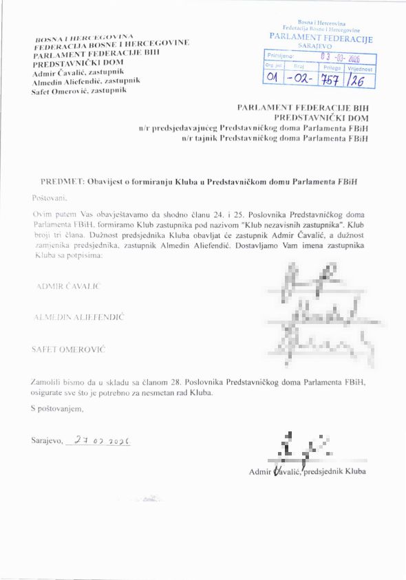 "Ovim putem Vas obavještavamo da shodno članu 24. i 25. Poslovnika Predstavničkog doma Parlamenta FBiH, formiramo Klub zastupnika pod nazivom “Klub nezavisnih zastupnika”. Klub broji tri člana. Dužnost predsjednika Kluba obavljat će zastupnik Admir Čavalić, a dužnost zamjenika predsjednika, zastupnik Almedin Aliefendić", stoji u dopisu kojeg potpisuju ova tri zastupnika.