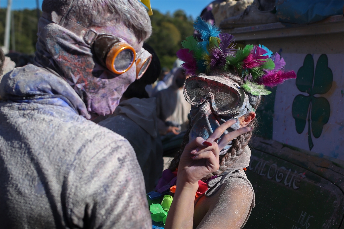 Učesnici su u svečarskom raspoloženju jedni na druge bacali obojeno brašno, stvarajući veselu i živahnu atmosferu ispunjenu muzikom i plesom.