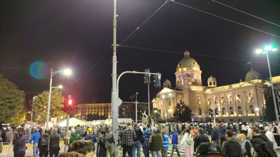 Jedna grupa došla je da podrži Dijanu Hrku, majku stradalog na Željezničkoj stanici u Novom Sadu, dok se druga nalazi ispred postavljenih šatora kod Skupštine.