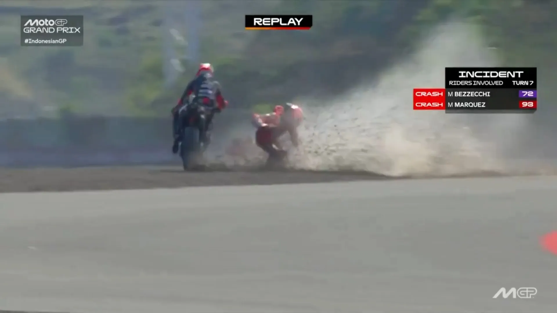 Talijan se preambiciozno upustio u dvoboj s Ducatijevim vozačem i naletio ravno na njega te su obojica završili na šljunku. Marquez je nakon incidenta prevezen u medicinski centar, jer ga je rame vidno boljelo.