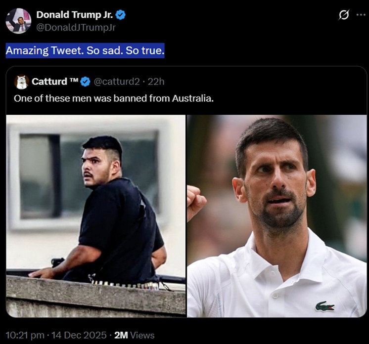 Donald Trump Jr., sin američkog predsjednika Donalda Trumpa, podijelio je jednu od objava koja se pojavila na X-u nakon jučerašnjeg terorističkog napada na plaži Bondi u Sydneyju.