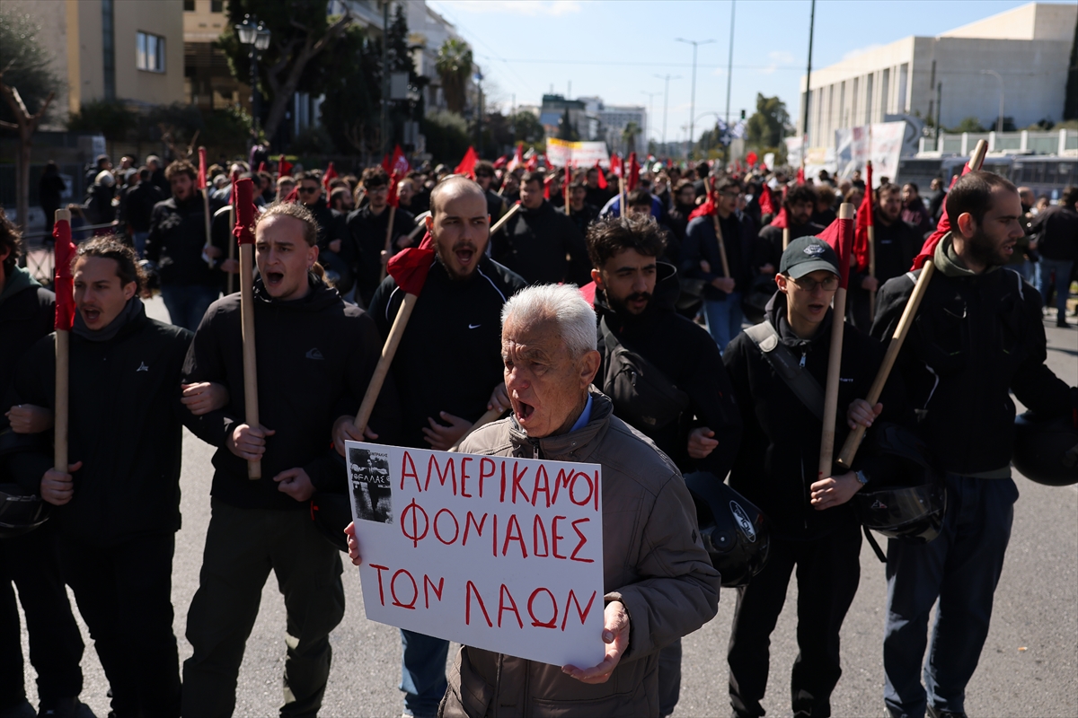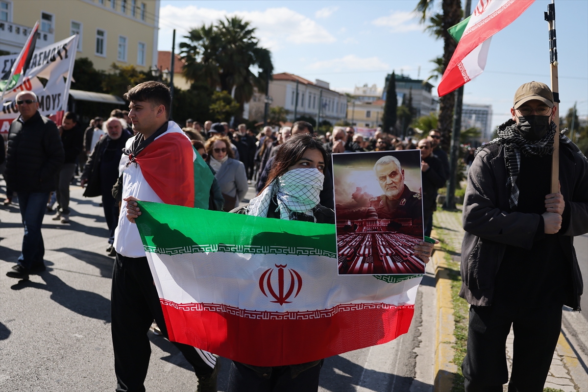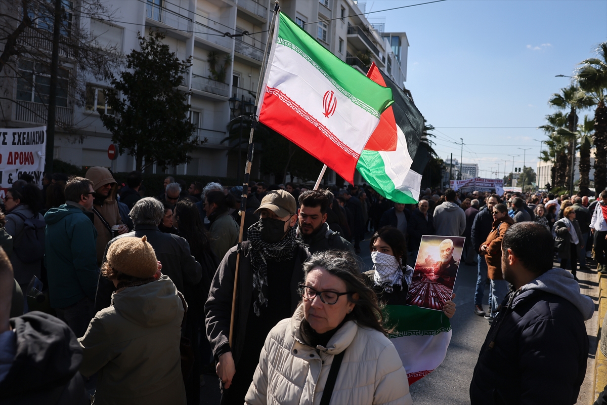 Demonstranti, uglavnom povezani s Grčkom komunističkom partijom, nose transparente i plakate na kojima piše "Ruke dalje od Irana" i "Zatvorite bazu Souda".
