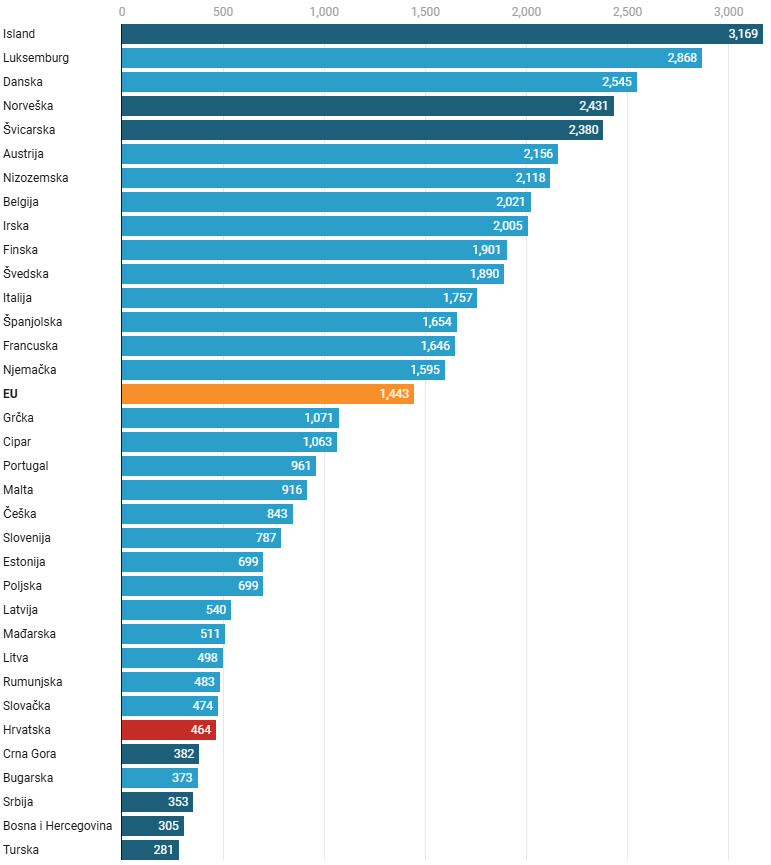 Unutar EU, raspon seže od 4.479 eura u Bugarskoj do 34.413 eura u Luksemburgu.