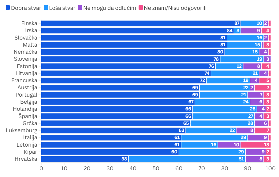 S druge strane, samo 38 odsto građana u Hrvatskoj smatra da je evro dobar za njihovu zemlju, što je pad od šest procentnih poena u odnosu na 2024. godinu, prenosi Euronews.