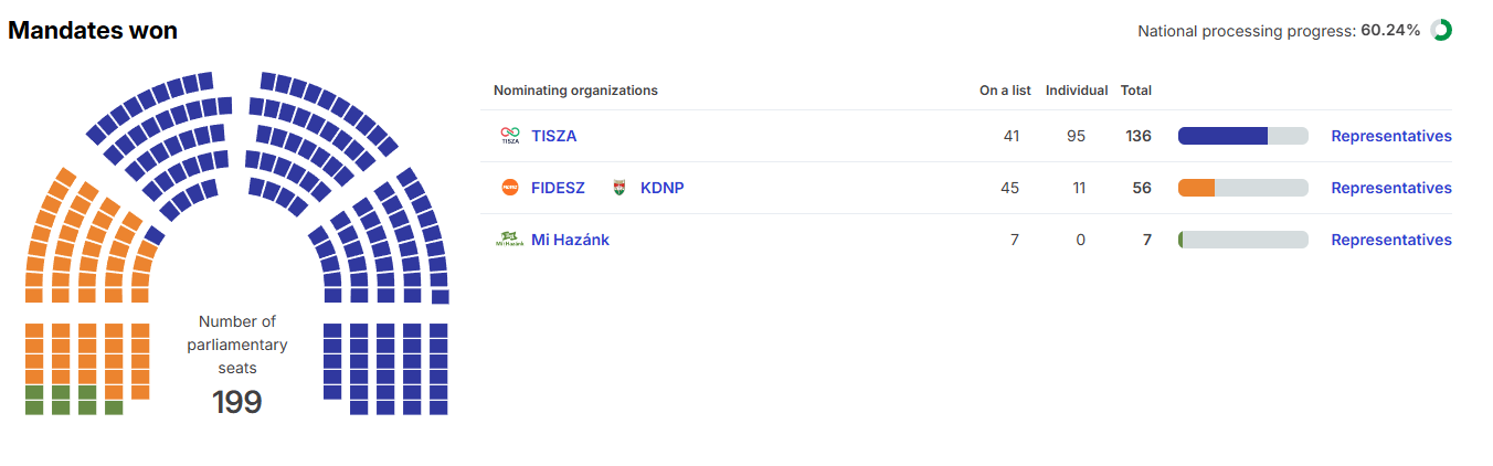 Uz 60,24 posto obrađenih glasova, Tisza učvršćuje vodstvo.