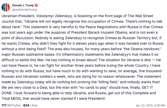 "Ukrajinski predsjednik Volodimir Zelenski hvali se na naslovnici Wall Street Journala izjavom: "Ukrajina neće pravno priznati okupaciju Krima. Tu nema o čemu razgovarati." Ova izjava ozbiljno šteti mirovnim pregovorima s Rusijom, jer je Krim izgubljen još prije mnogo godina, dok je predsjednik SAD-a bio Barack Hussein Obama, i danas nije ni predmet rasprave.