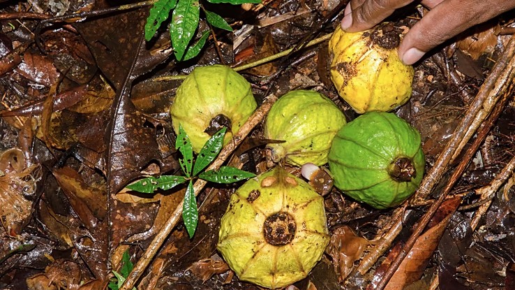 Branje plodova s ovog 18 metara visokog drveta iz Papue Nove Gvineje relativno je jednostavno. Proizvode se na stabljikama koje se spuštaju od debla i protežu se niz tlo do sedam metara, stvarajući bijele cvjetove.