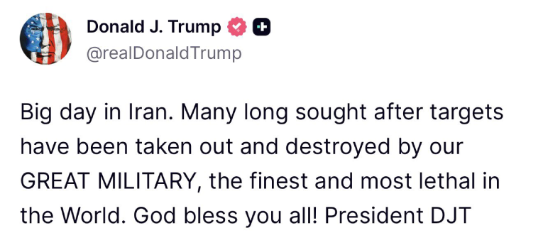 "Veliki dan u Iranu. Mnogi dugo traženi ciljevi su uklonjeni i uništeni od strane naše velike vojske, najbolje i najsmrtonosnije na svijetu. Bog vas sve blagoslovio!", napisao je Trump.