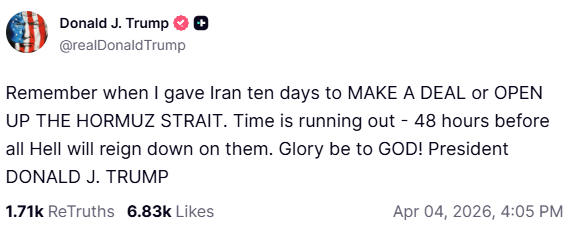 "Sjećate se kad sam Iranu dao deset dana da postigne dogovor ili otvori Hormuški tjesnac? Vrijeme istječe - još 48 sati prije nego što im stigne pakao. Slava BOGU", napisao je Trump.