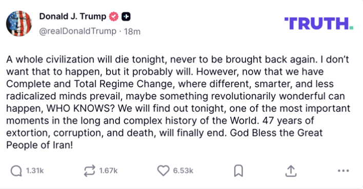 Trump: Cijela civilizacija će večeras umrijeti i nikada se više neće vratiti
