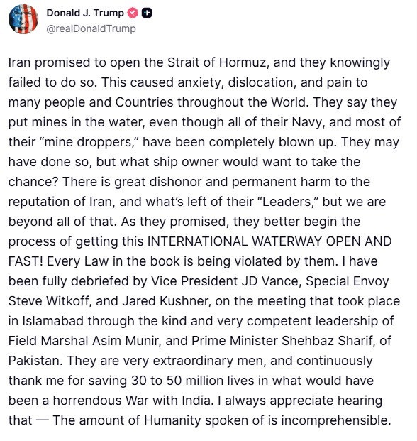U drugoj objavi Trump je optužio Iran da nije ispunio obećanje o otvaranju Hormuškog moreuza.
