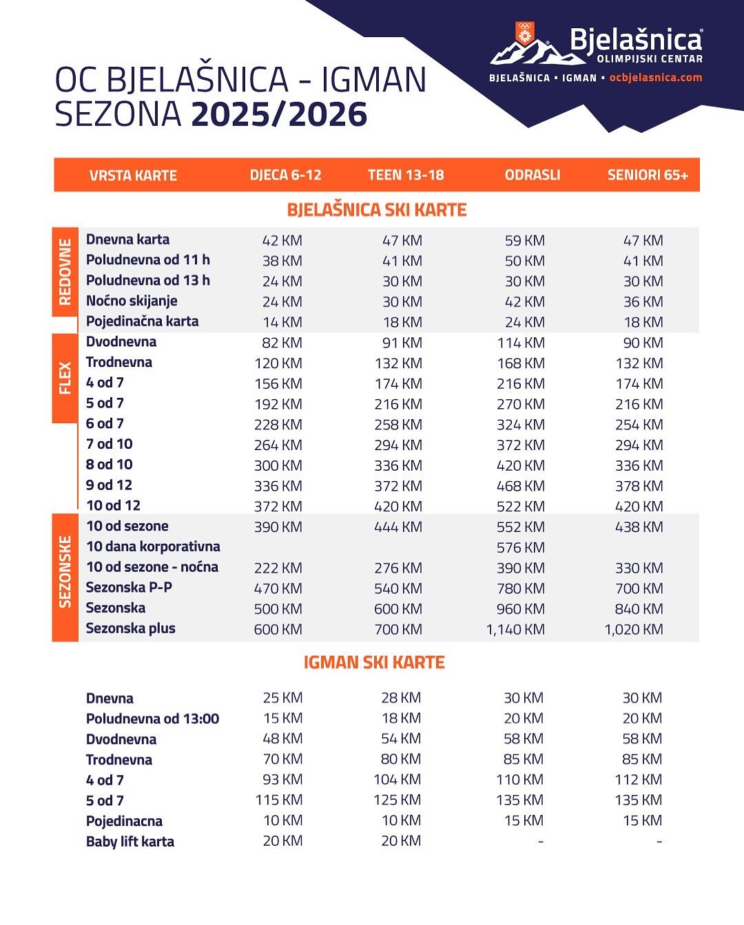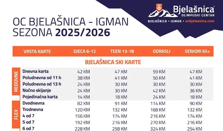 Prema redovnom cjenovniku, cijena dnevne karte za odrasle iznosit će 59 KM, a za djecu do 12 godina 42 KM. To znači da roditelj koji djetetu kupi sezonsku kartu, već nakon sedam dana skijanja ostvaruje značajnu uštedu u odnosu na redovnu kupovinu, što sezonsku kartu čini najisplativijim izborom, istaknuto je iz Olimpijskog centra Bjelašnica.