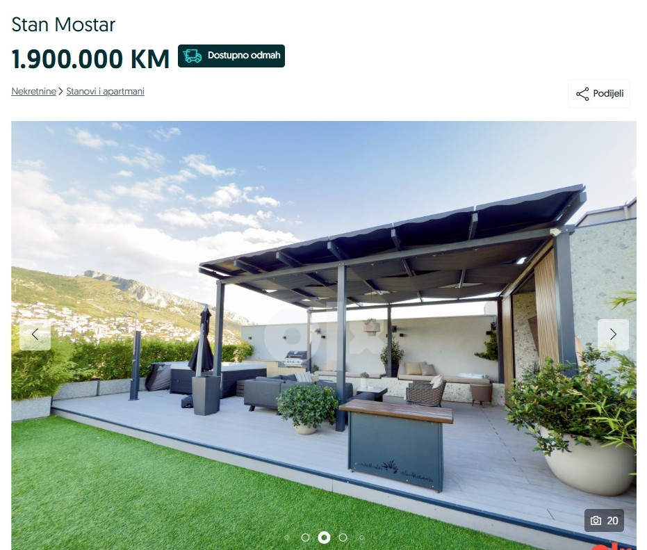 Riječ je o nekretnini koja se nalazi u Mostaru. Sa korisnom površinom od 264 m2, posjeduje tri kupatila, terasu od 250m2 i dva garažna mjesta, koja su uključena u cijenu (ukupno 30 m2) i to sve sa najljepšim panoramskim pogledom na Mostar. Izgrađen je 2010. godine i predstavlja rijetku priliku na tržištu, dok galerija s 20 fotografija zaista sugeriše da je riječ o luksuznom prostoru.