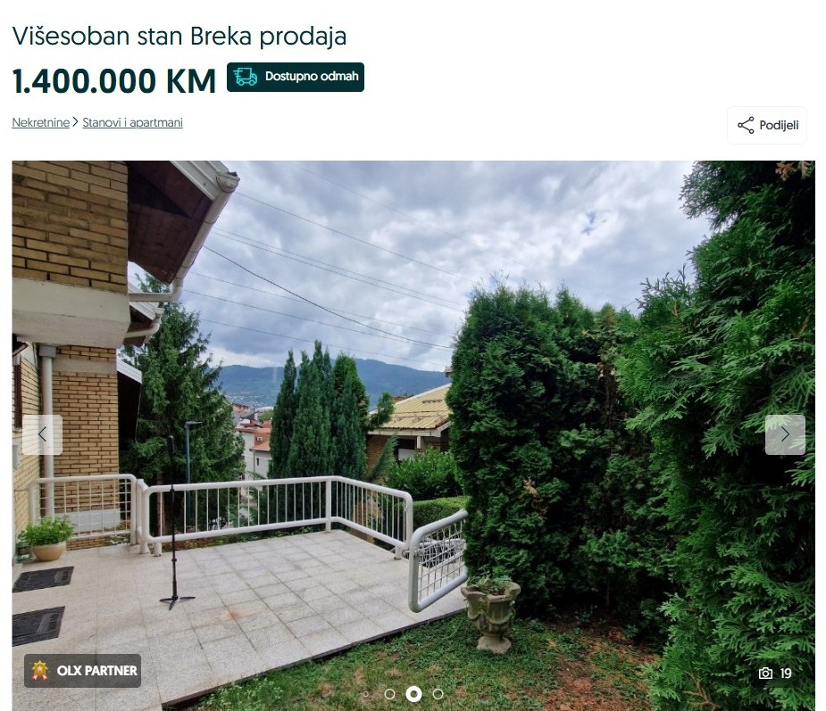 Druga najskuplja nekretnina na ovoj platformi jeste stan koji se prodaje u Sarajevu, a nalazi se u naselju Breka. Ova vrlo zanimljiva nekretnina, podijeljena je na dvije zasebne jedinice, a jednim zahvatom može postati kuća na dva sprata. Stan ima više od pet soba i kupatila, sa korisnom površinom od 261 kvadrata.