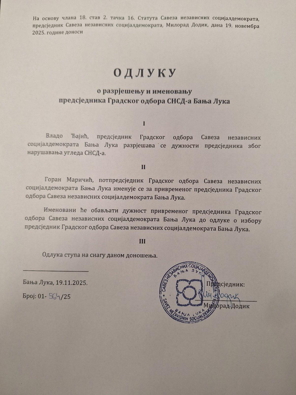 "Imenovani će obavljati dužnost privremenog predsjednika Gradskog odbora SNSD-a Banjaluka do odluke o izboru predsjednika GrO SNSD Banjaluka", navodi se u odluci.
