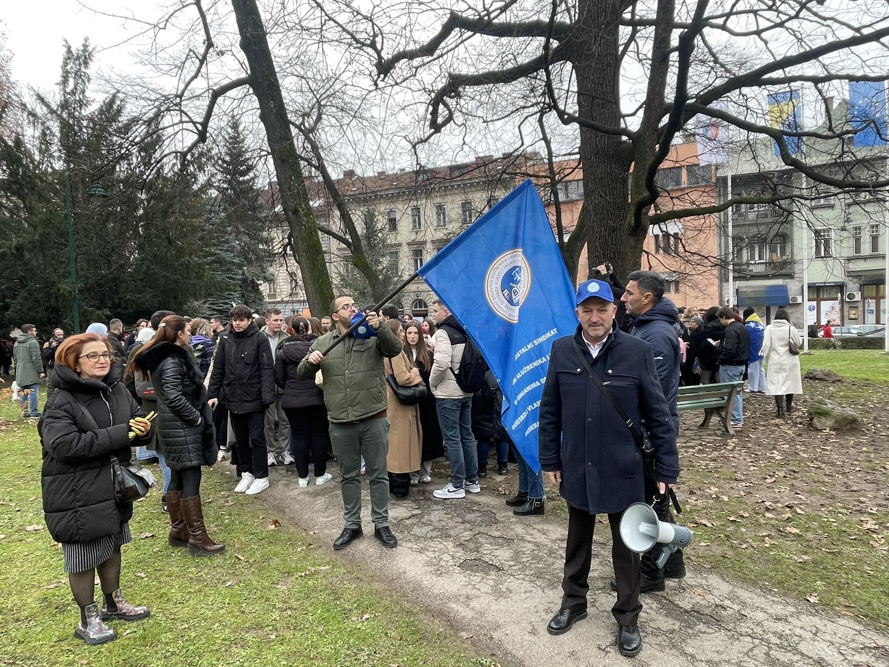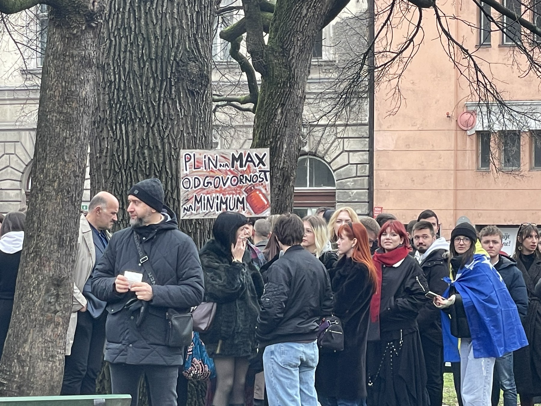 Studenti protestuju ispred zgrade Vlade Kantona Sarajevo, gdje bi protest, prema najavama, trebao trajati do 13 časova. Nose transparente "Lahko je vladati pustom državom", "Kako bi objasnili našim roditeljima", "Plin na max, odgovornost na minimum", "Hej, Uče, lopove, sve ti oči govore".