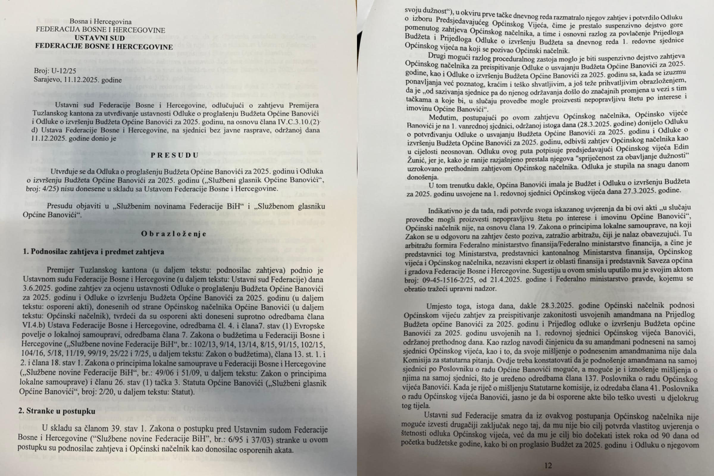 Ustavni sud Federacije Bosne i Hercegovine donio je presudu kojom je utvrdio da Odluka o proglašenju Budžeta Opštine Banovići za 2025. godinu i Odluka o izvršenju Budžeta za 2025. godinu, koje je donio načelnik, nisu u skladu sa Ustavom Federacije BiH.