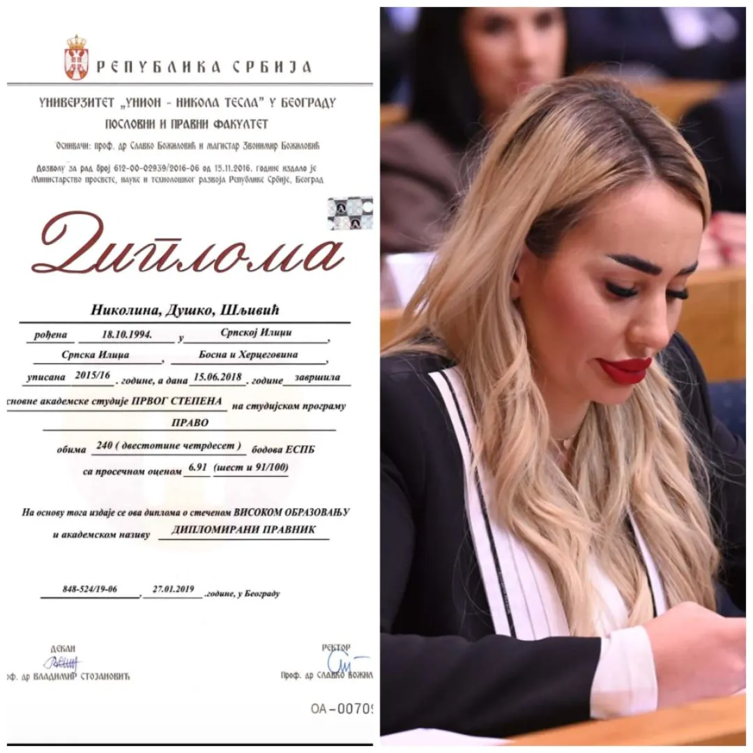 Nikolina Šljivić, samostalni poslanik u Narodnoj skupštini Republike Srpske i novoimenovani vršilac dužnosti zamjenika direktora RUGIPP-a, saopštila je danas da je potpuna neistina da je završila fakultet za četiri mjeseca, dostavljaljući medijima uvid u svoju diplomu.
