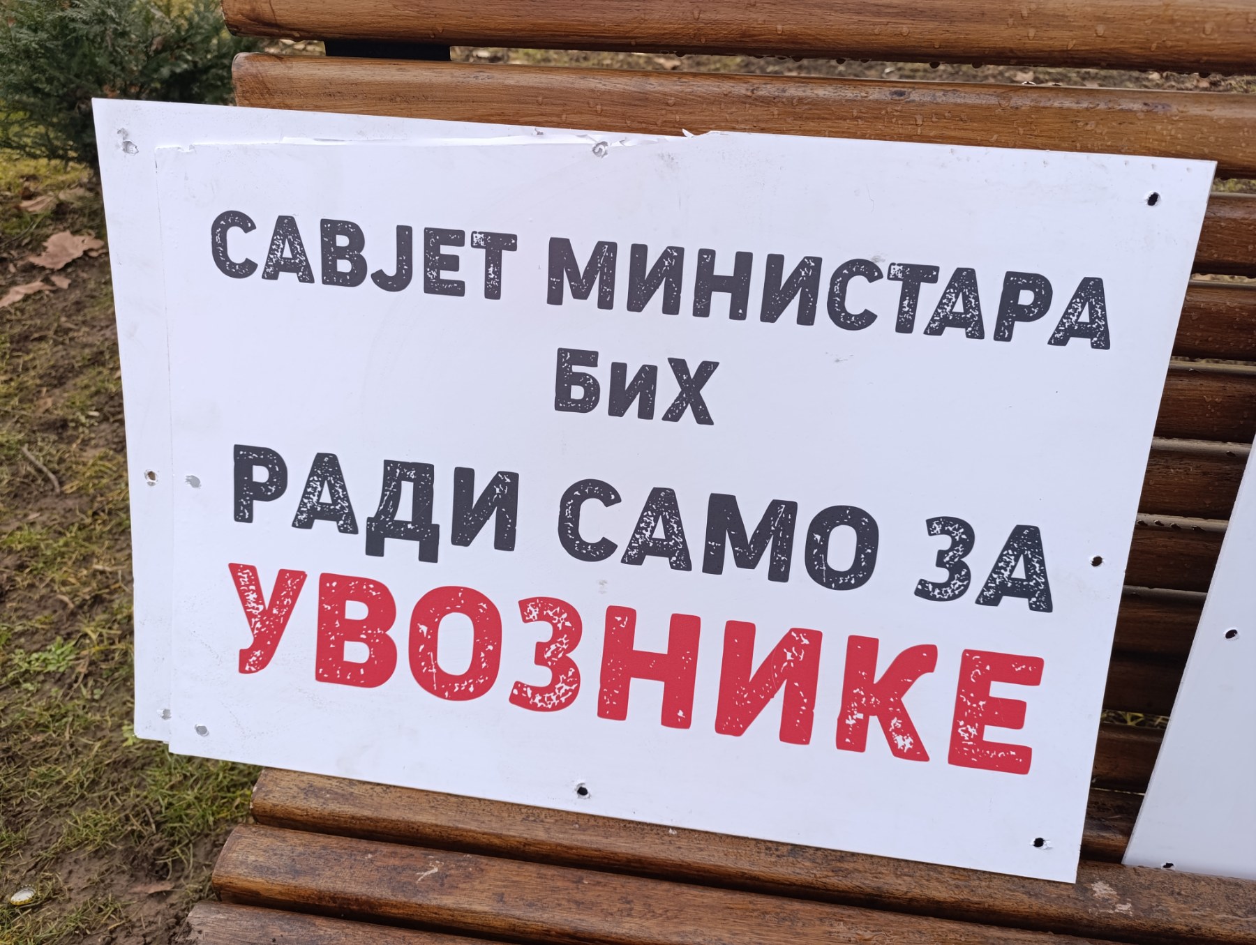 Okupljeni proizvođači mlijeka u parku su postavili transparente sa kojih poručuju: “Savjet ministara BiH radi samo za uvoznike”. Na jednom transparentu piše “SSP, CEFTA: to nisu sporazumi, to su nesporazumi. Uništi nas uvoz”.