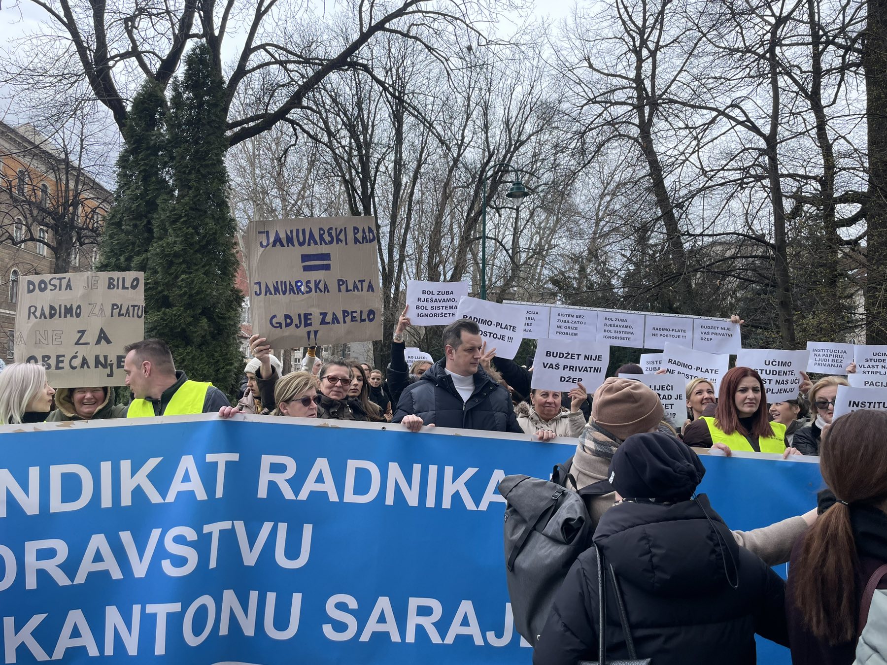 Radnici Stomatološkog fakulteta u Sarajevu stigli su na proteste ispred zgrade Vlade Kantona Sarajevo, koje organizira Sindikat radnika u zdravstvu KS.