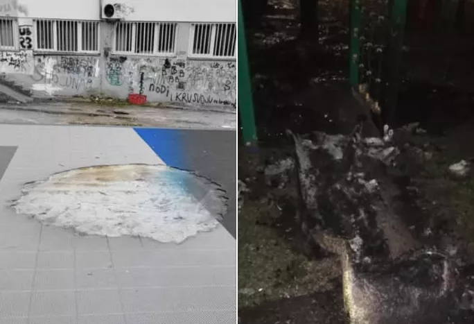 Igralište je zapaljeno samo nekoliko sati nakon što su radovi završeni, a sprave i plastična podloga postavljeni.