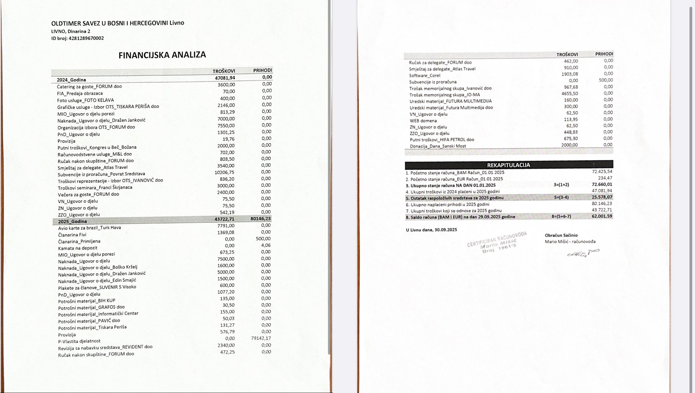 "U finansijskoj analizi, koja pokazuje dio potrošenih sredstava, može se vidjeti da je Vrdoljak ketering plaćala 3.600 KM, večere 2.400 KM, a pojedincima je putem ugovora o djelu isplaćivano i preko 10.000 KM za usluge koje Nadzornom odboru nisu predočene. Da stvar bude gora, 7.500 KM isplaćeno je nepoznatom licu čije ime i ne stoji u finansijskoj analizi", kažu iz Oldtimer saveza BiH.