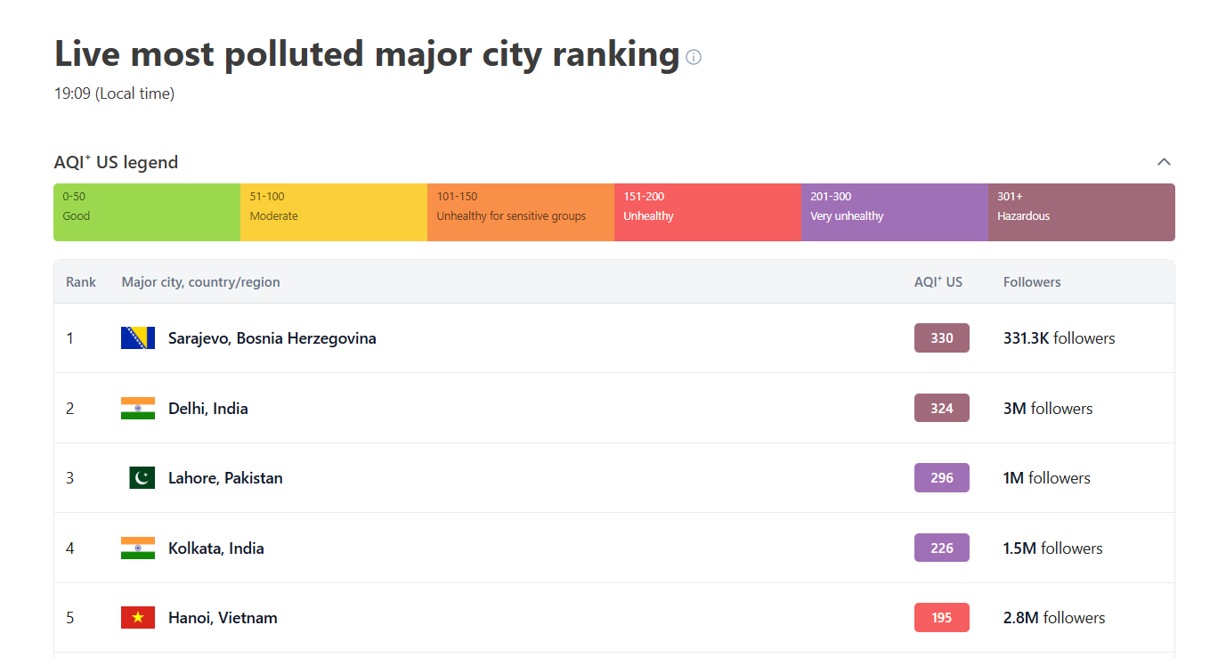 Portal IQAir, koji prati indeks zagađenja zraka u svijetu, u 19.09 časova je objavio ažuriranu listu gradova na kojoj se Sarajevo našlo na prvom mjestu sa indeksom kvaliteta zraka 330, što ga stavlja u kategoriji "vrlo nezdrav" po zdravlje.