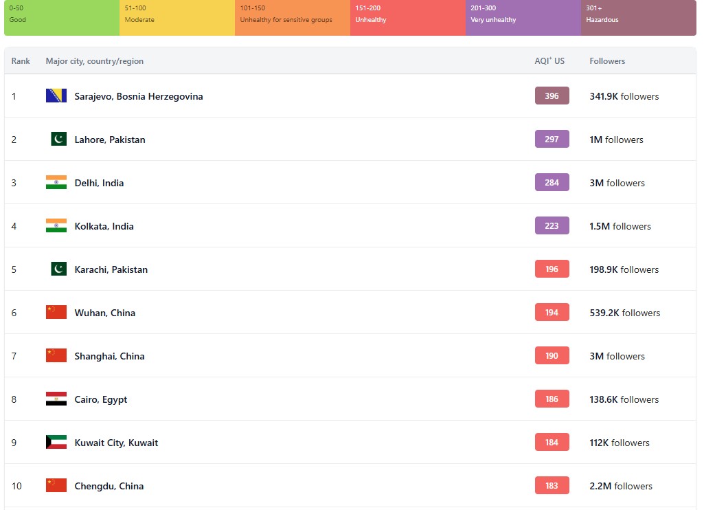 Lista najzagađenijih gradova (Izvor: Screenshot/IQAir)
