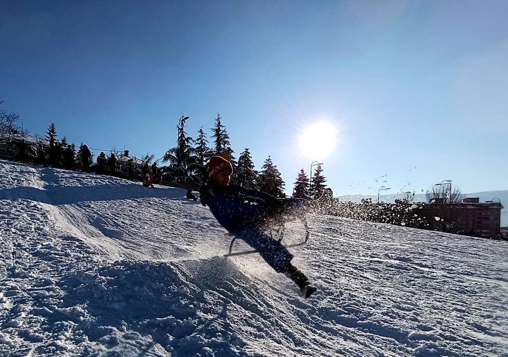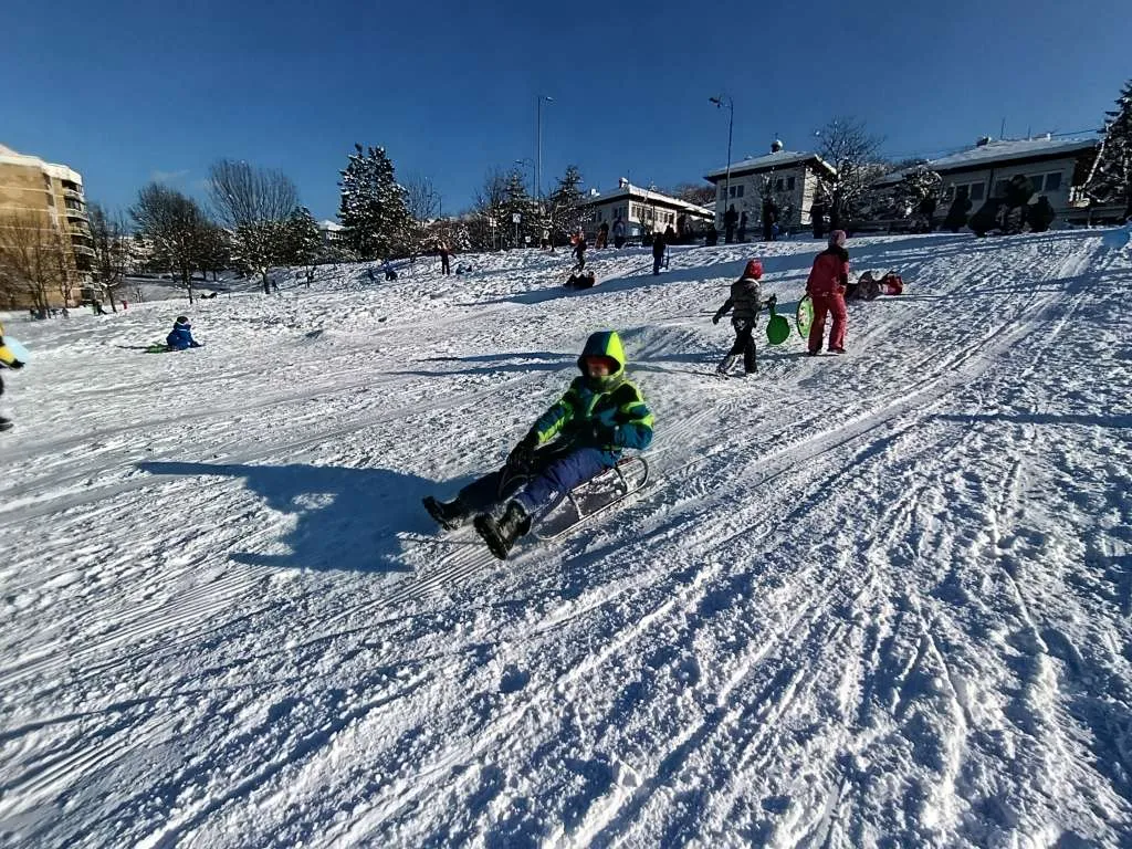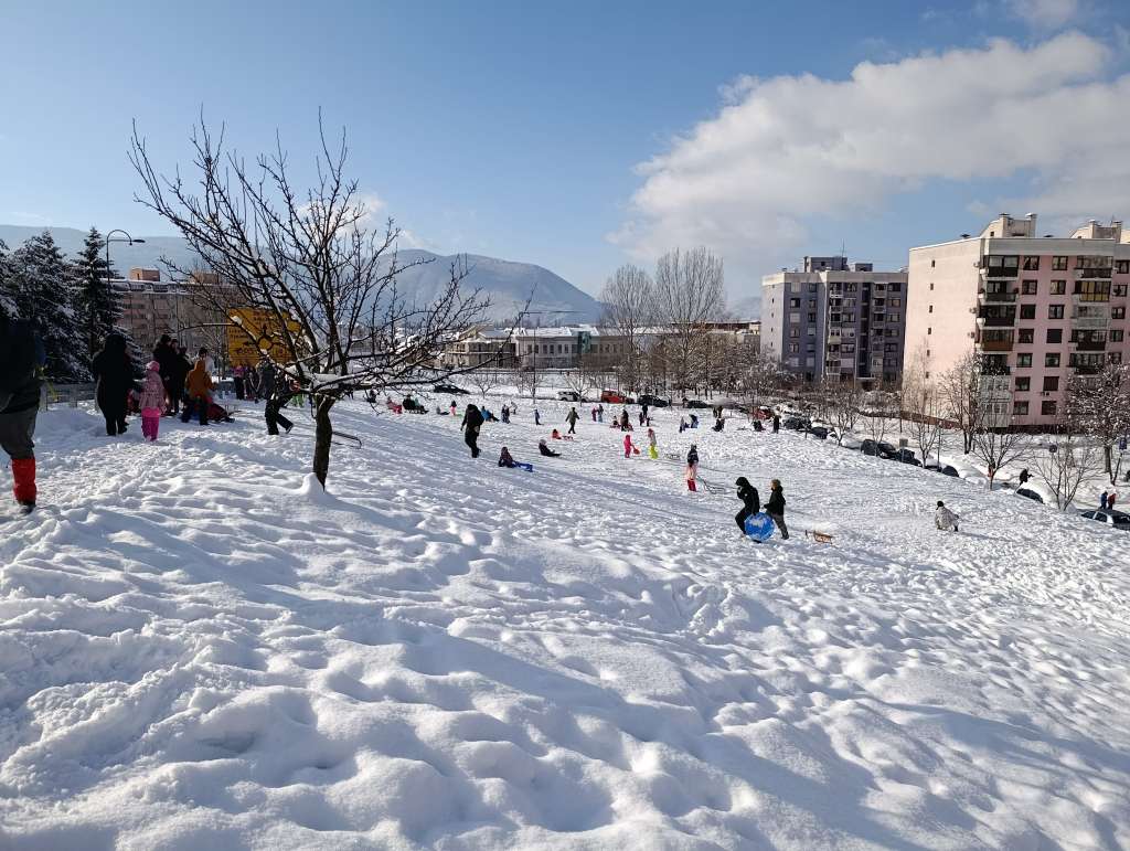 Brojni mališani iskoristili su sunčan dan u dječijim radostima sankanju i igranju na snijegu u sarajevskom naselju Mojmilo.