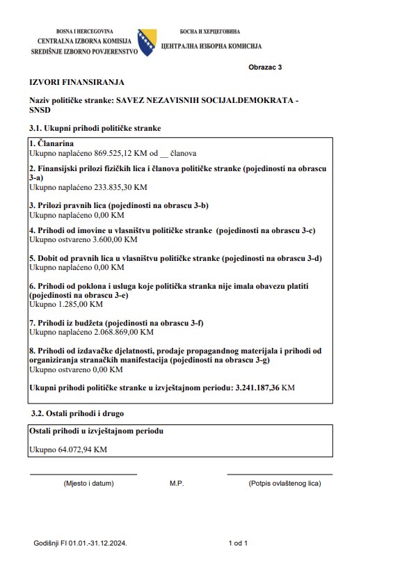 Prema podacima Centralne izborne komisije BiH, tokom 2024. godine SNSD je prihodovao iz budžeta više od dva miliona KM (2.068.869,00).