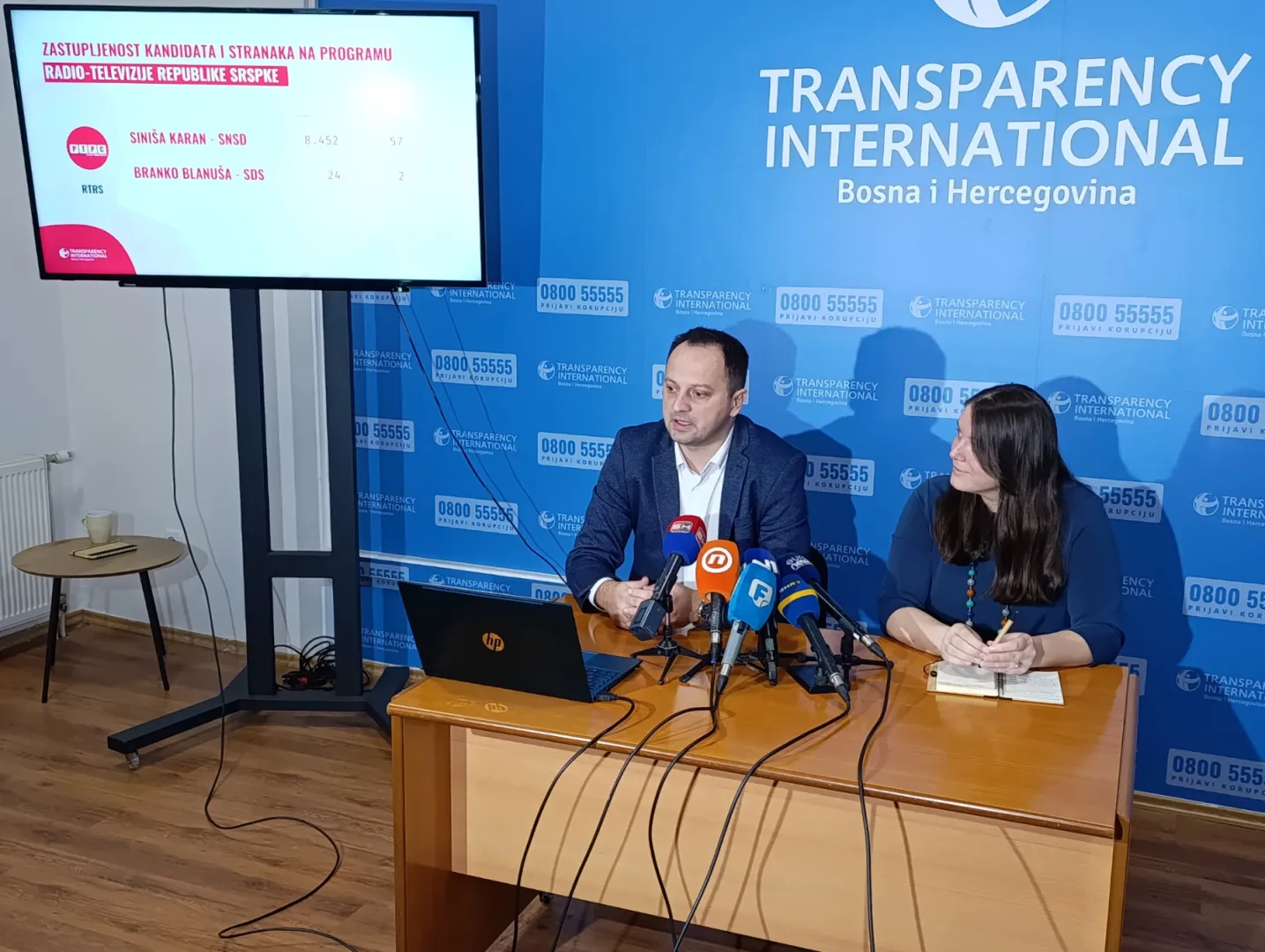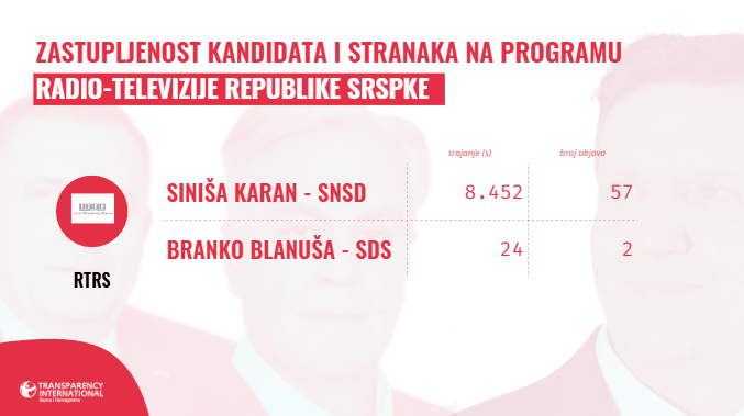 U promociju kandidata vladajuće kolaicije posebnu ulogu imao je javni servis RTRS koji je, prema mjerenju agencije koju je angažovao TI BIH, za 11 dana kampanje u svojim informativnim emisijama Sinišu Karana prikazao čak 57 puta kroz 2 sata i 20 minuta programa. U istom periodu u informativnim emisijama RTRS-a Branko Blanuša dobio je 20-ak sekundi prostora, gdje su prikazane dvije njegove izjave.