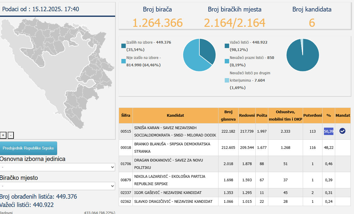 Karan osvojio 222.182 glasa, 9.577 više od Blanuše (Izvor: CIK BiH)