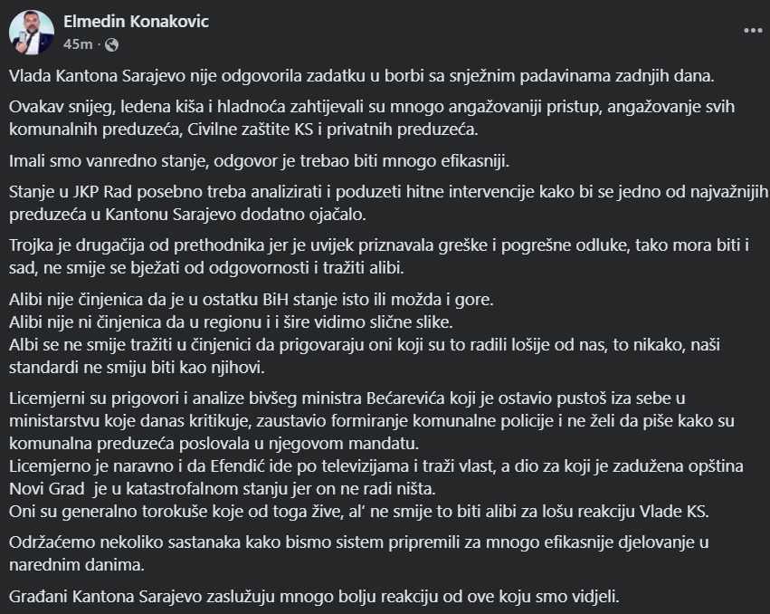 "Vlada Kantona Sarajevo nije odgovorila zadatku u borbi sa snježnim padavinama zadnjih dana. Ovakav snijeg, ledena kiša i hladnoća zahtijevali su mnogo angažovaniji pristup, angažovanje svih komunalnih preduzeća, Civilne zaštite KS i privatnih preduzeća. Imali smo vanredno stanje, odgovor je trebao biti mnogo efikasniji", kaže Konaković.