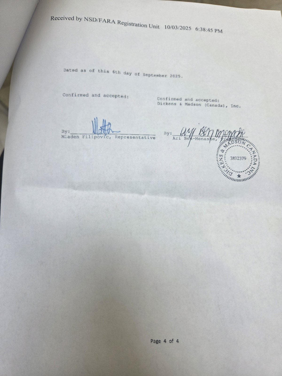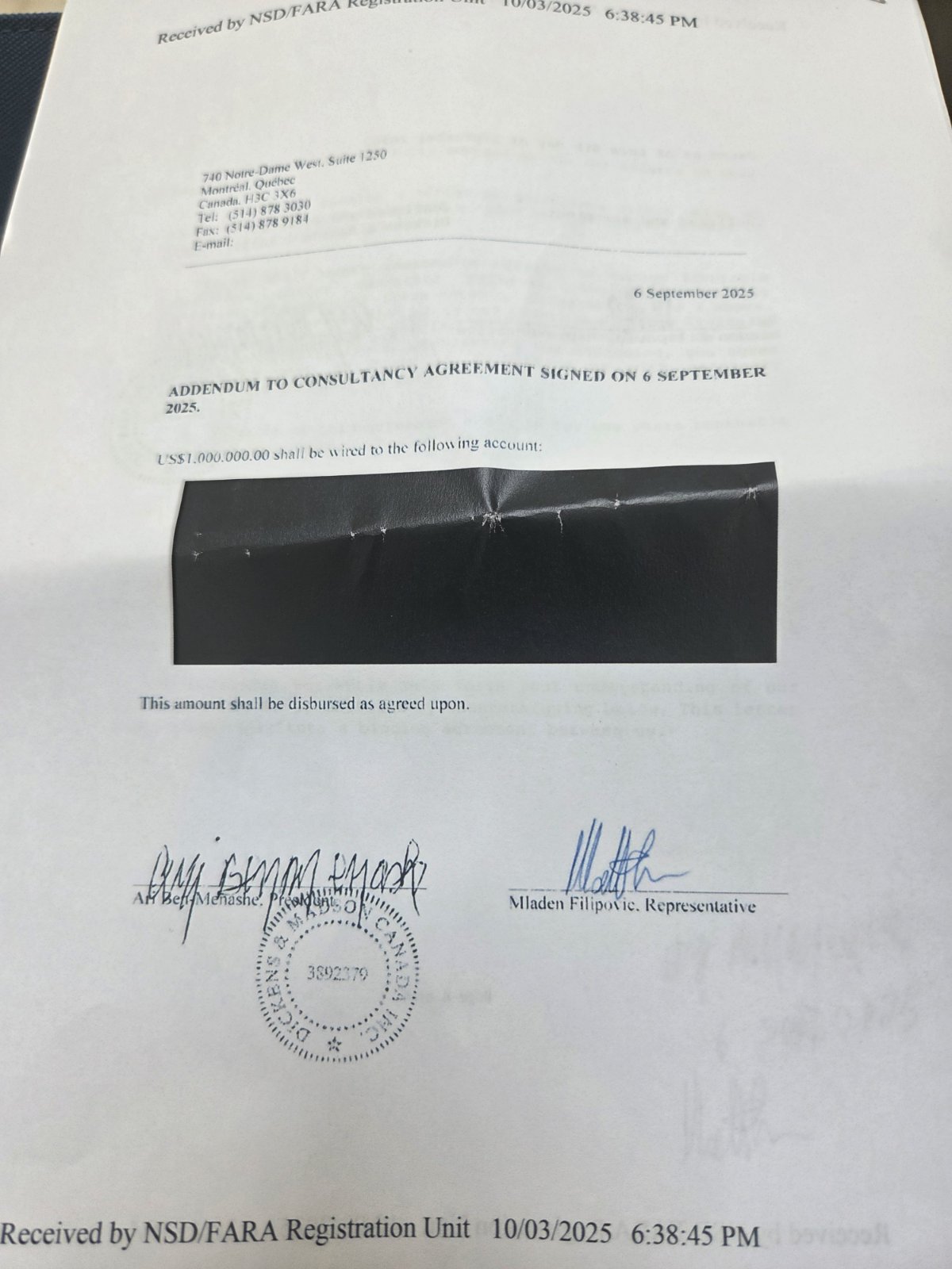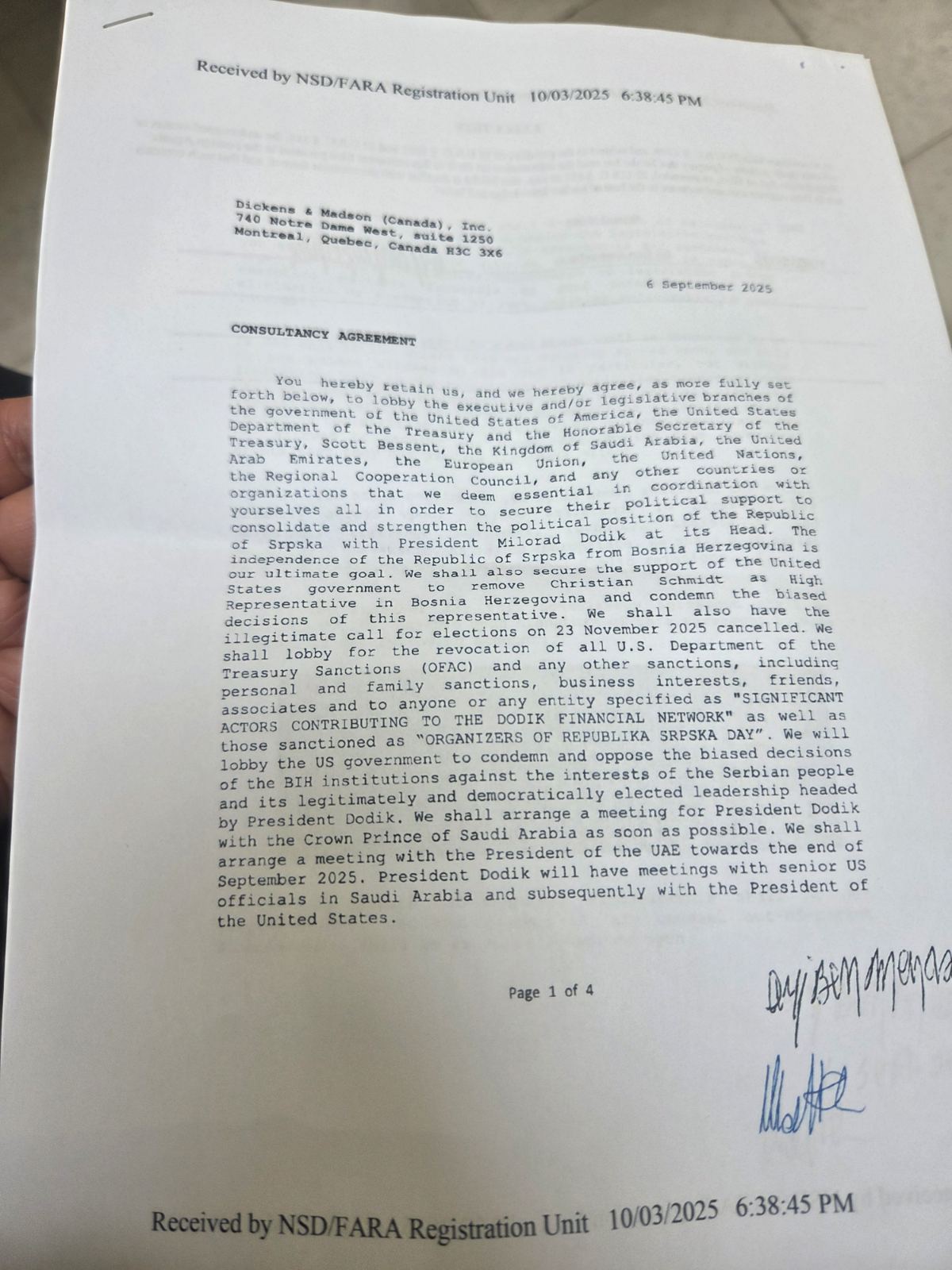 "Dokument do posljednjeg detalja objašnjava način, tehniku, plan i implementaciju Dodikovog lobiranja u SAD-u. Riječ je o ugovoru koji je Dodik potpisao s konsultantskom kućom ‘Dickens & Madson’ iz Kanade", rekao je Konaković.
