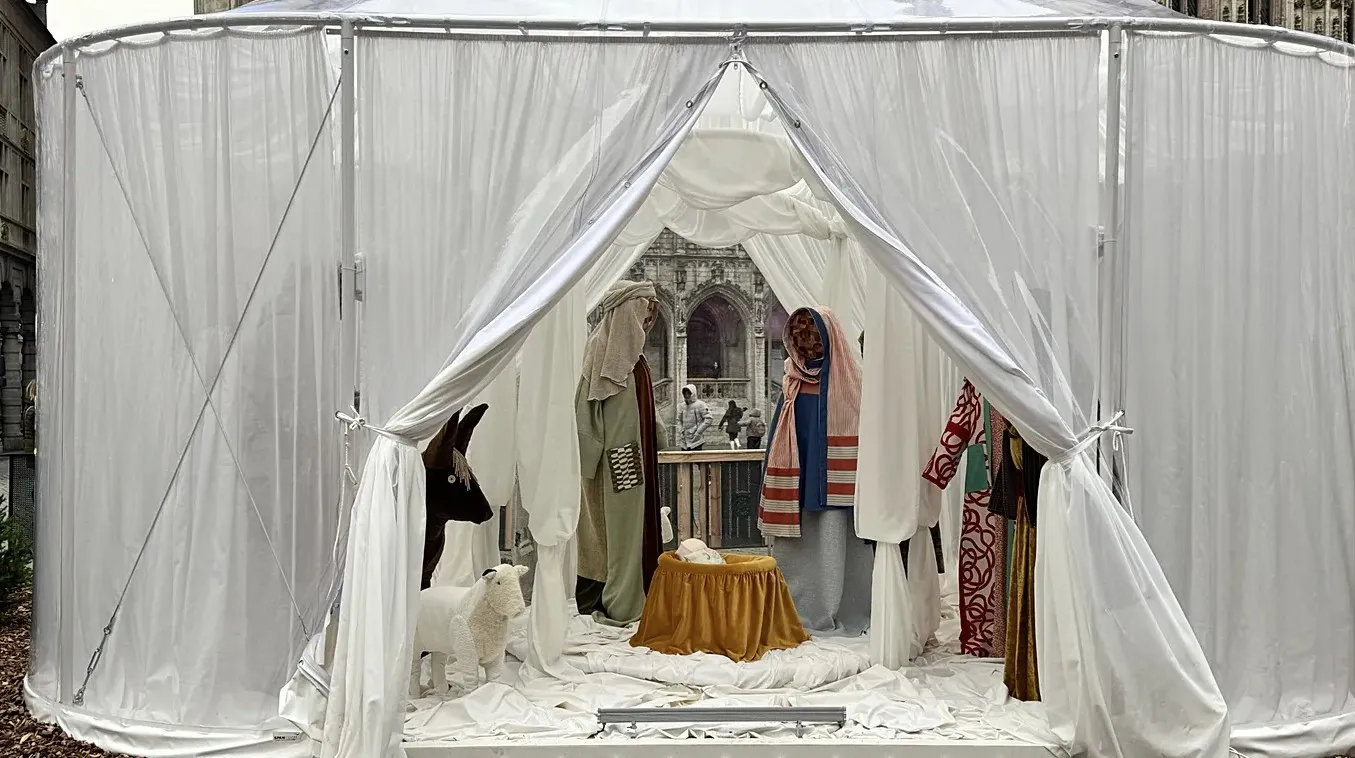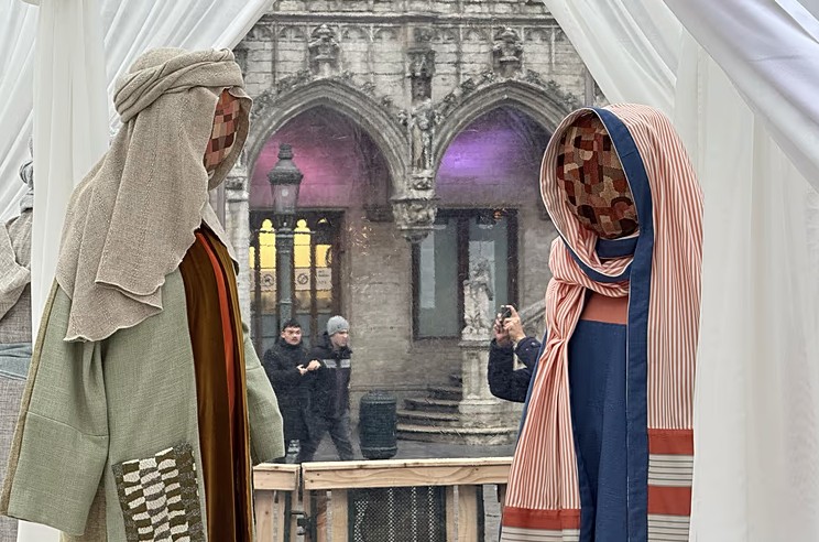 Jaslice s likovima s platnenim licima, umjetnice Victorije-Marije Geyer, izložene su u bijelom šatoru u Briselu, 1. decembra 2025. (Izvor: AP Photo)